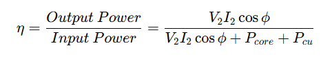 Frequency (f)Supply frequency in HzCore losses depend on frequency; efficiency decreases if frequency deviates from design